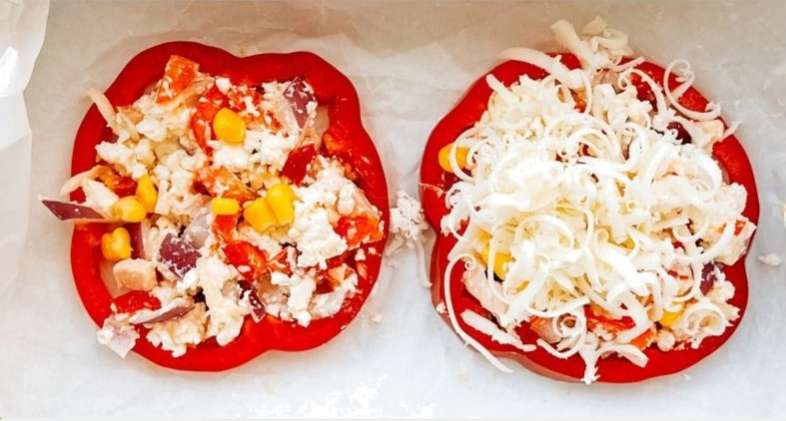 Для начинки смешиваем творог, сыр, кукурузу, курицу, болгарский пepeu и яйцо. Кольца болгарского перца выкладываем на противень, застеленный пергаментной бумагой, фаршируем начинкой и эапекаем в духовке при 180 градусах 25-30 мин.