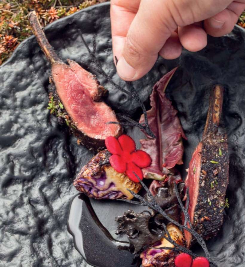 В этом рецепте для тартара я использую мякоть шеи оленя (можно взять и вырезку). Нарезать мясо мелкими кубиками. Добавить желток утиного яйца, мелко нарезанный лук-шалот, соль, перец и сублимированный ревень.