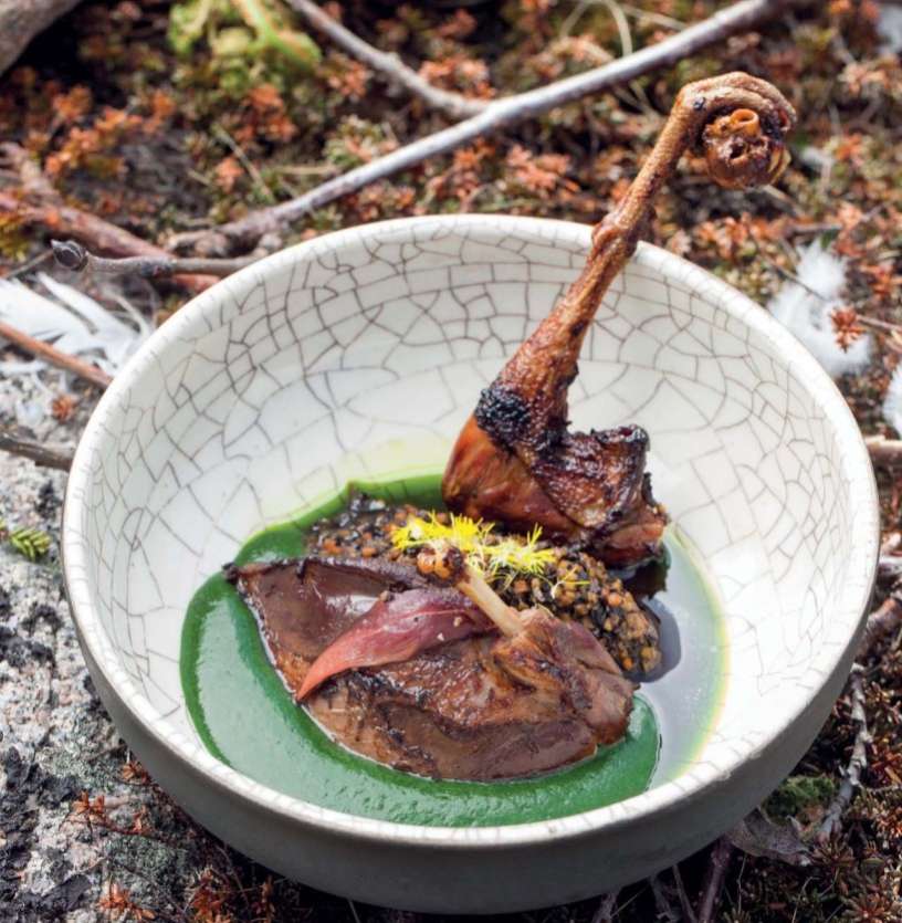 Когда вся жидкость выпарится, лук готов. Его можно пюрировать в блендере или в ступке. Сделать чипсы из зеленого лука (понадобится только зеленая часть). Выложить лук на противень, чуть посыпать солью и поместить в печь, пока лук не сгорит.Для подачи выложить крем из лука-порея, потом тартар, а затем жженый зеленый лук и сублимированный ревень с маминого огорода