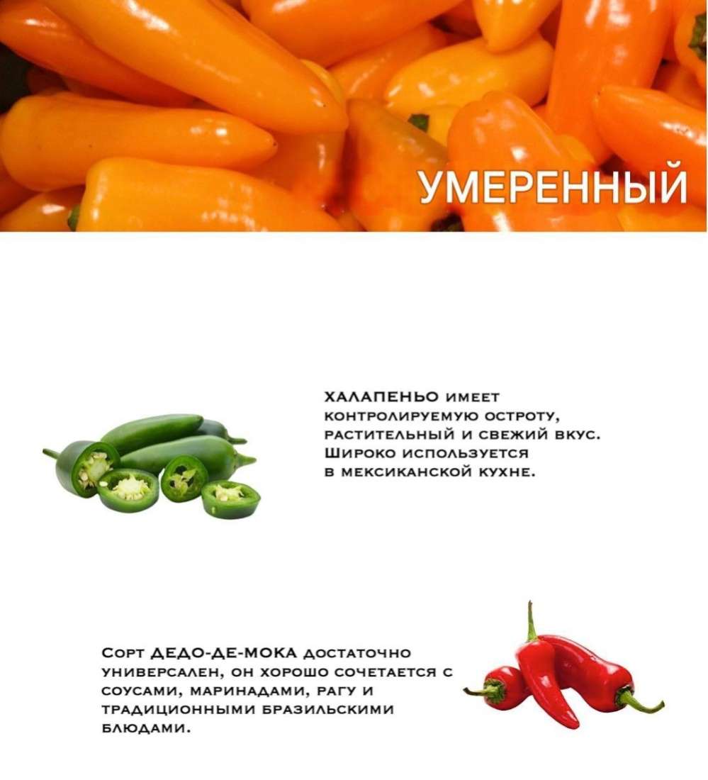Болгарский перец – 0 SHU, Халапеньо – 2,5–8 тыс. SHU, Хабанеро – 100–350 тыс. SHU.