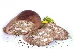 8.49 С НДСОтварное колбасное изделие высшего сорта, представляющее собой рубленую массу из мяса и свиных продуктов с добавлением маринованных корнишонов, приготовленное в текстильной оболочке. Разновидность зельца с пикантным вкусом.